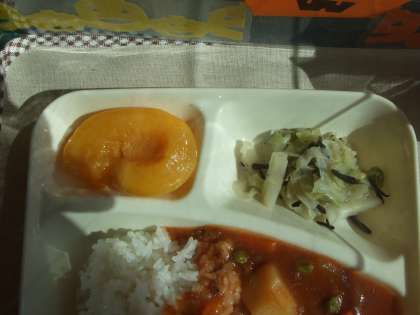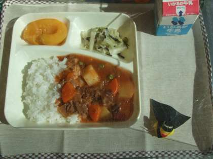 10月27日(火)の給食はハヤシライス、キャベツのひじきドレッシング、黄桃、牛乳です。ハヤシライスは子ども達の人気メニュー、ぎゅうにく、じゃがいも、たまねぎ、にんじん、グリンピース、セロリ、にんにくが入っています。キャベツのひじきドレッシングははひじきが入ったあっさり味です。おいしかったです。ごちそうさまでした。