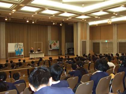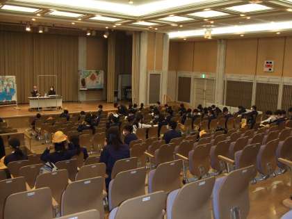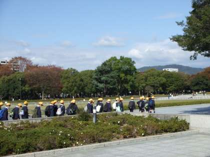 11月2日(月)被爆体験の方のお話を聞いています。平和記念公園に青空が広がっています。