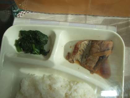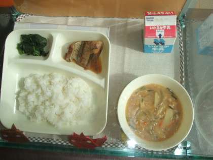 11月6日(金)の給食はなまりぶしのしょうが煮、みそ汁、ほうれんそうのおひたし、ごはん、牛乳です。なまりぶしは甘辛く味付けしてあります。みそ汁はじゃがいも、うすあげ、たまねぎ、にんじん、ブラックマッペもやし、あおねぎ、えのきたけ、が入ってあかみそ、しろみそで味付けしてあります。おいしかったです。ごちそうさまでした。