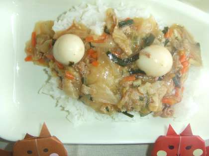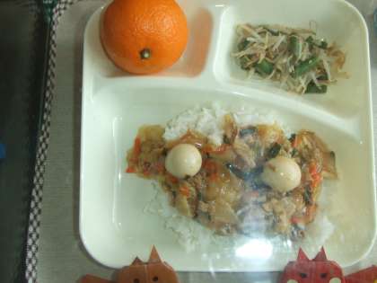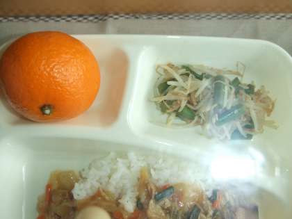 11月10日(火)の給食は中華丼、もやしとさんどまめの中華あえ、みかん、牛乳です。中華丼はぶたにく、うずらたまご、はくさい、たまねぎ、たけのこ、にんじん、にら、しょうが、しいたけが入っています。もやしとさんどまめの中華あえはブラックマッペもやし、さんどまめを中華風にあえています。おいしかったです。ごちそうさまでした。