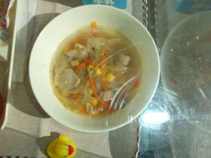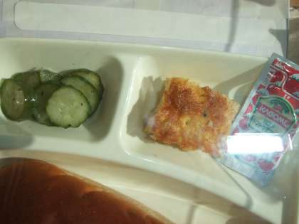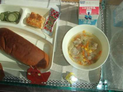 11月12日(木)の給食はツナポテトオムレツ、スープ、きゅうりのバジル風味サラダ、パン、牛乳です。ツナポテトオムレツはけいらん、ツナかんづめ、じゃがいも、バターが入りけケチャップをつけていただきました。スープはぶたにく、ウインナーソーセージ、たまねぎ、キャベツ、にんじん、コーン、パセリが入っています。きゅうりのバジル風味サラダはきゅうりをワインビネガーやしょうゆで味付けしています。おいしかったです。ごちそうさまでした。