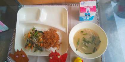 11月13日(金)の給食は新メニュー、ドライカレービビンバ、トック、牛乳です。ドライカレービビンバはぎゅうひきにく、ぶたひきにく、にんにく、だいこん、ほうれんそう、ブラックマッペもやし、ニンジンが入っていてよく混ぜていただきます。トックはささみ、たまねぎ、にら、えのきたけが入っています。おいしかったです。ごちそうさまでした。
