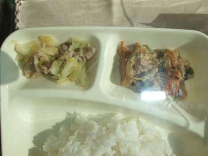 11月20日(金)の給食は、鶏肉のごまだれ焼き、なめこのみそ汁、キャベツのいためもの、ごはん、牛乳です。鶏肉のごまだれ焼きはけいにくに、たまねぎ、ピーマンをねりごまやしょうゆなどで甘辛く味付けしてあります。なめこのみそ汁はだいこん、にんじん、なめこが入っています。キャベツのいためものはぶたにく、キャベツが入っています。どれもごはんによく合いおいしかったです。