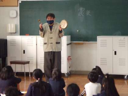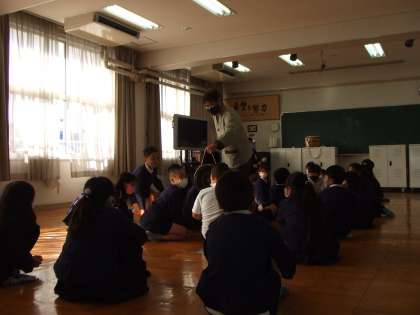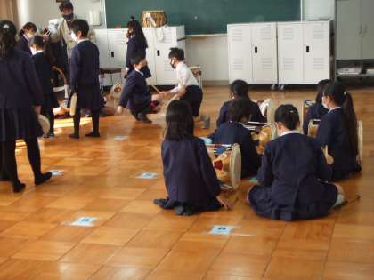 11月24日(火)3年生は課内実践で韓国・朝鮮についての勉強をしています。ソンセンニムから楽器を習っています。