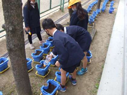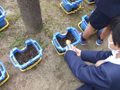 11月27日(金)1年生は休み時間に「早く大きくなってきれいな花が咲くように。」と願いながらチューリップに水をあげています。