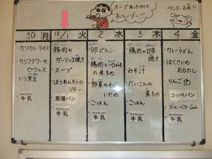 12月1日(火)給食室の掲示物です。今週はカレーに始まりカレーに終わります。月曜日カツカレー。金曜日カレーうどん。
