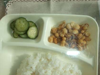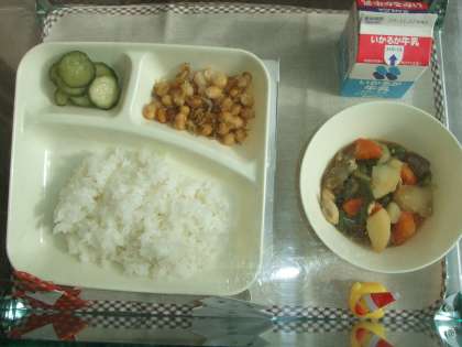 12月7日(月)の給食は鶏肉と野菜の煮もの、じゃこ豆、あっさりきゅうり、ごはん、牛乳です。鶏肉と野菜の煮ものはけいにく、たまねぎ、ごぼう、にんじん、さんどまめ、が入っています。じゃこ豆は揚げた大豆を甘辛くしてじゃこをちりばめています。おいしかったです。ごちそうさまでした。