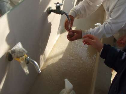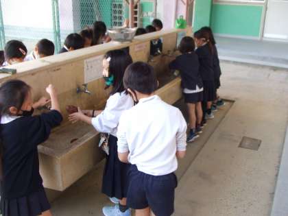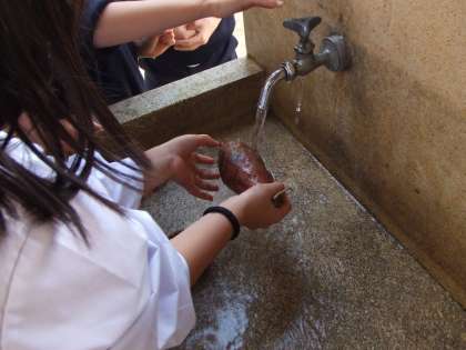 12月10日(木)2年生はさつまいもを洗っています。おいしそうですね。少し水が冷たいようです。