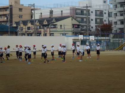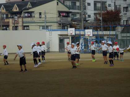 12月11日(金)寒い朝ですが子ども達は元気です。2年生は体育、運動場でなわとびです。