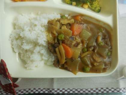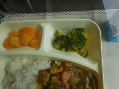 12月14日(月)の給食は冬野菜のカレーライス、ブロッコリーとコーンのサラダ、黄桃、牛乳です。冬野菜のカレーライスは人気メニューの一つ、ぎゅうにく、たまねぎ、だいこん、れんこん、にんじん、グリンピース、が入っています。ブロッコリーとコーンのサラダはあっさり味でした。おいしかったです。ごちそうさまでした。