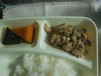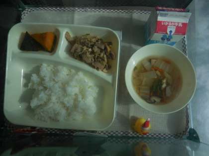 12月17日(木)の給食は豚肉と干しずいきのみそ煮、すまし汁、焼きかぼちゃの甘みつかけ、ごはん、牛乳です。豚肉と干しずいきのみそ煮はぶたにく、うすあげ、あおねぎ、干しずいきが入っています。すまし汁はけいにく、はくさい、だいこん、にんじん、みつば、しいたけ、が入っています。おいしかったです。ごちそうさまでした。