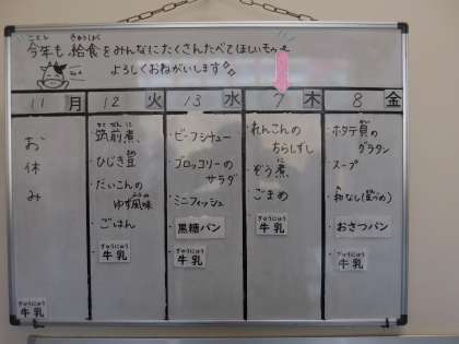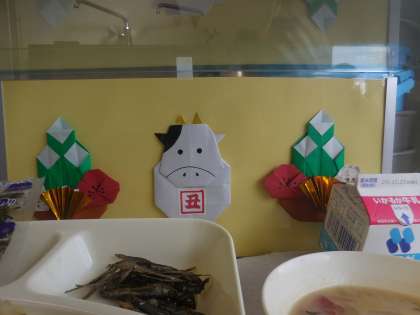 1月7日(木)給食室はお正月の雰囲気です。今年もおいしい給食よろしくお願いします。