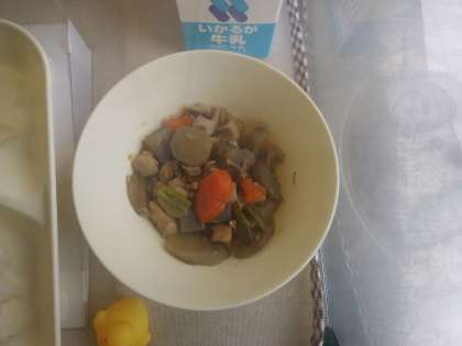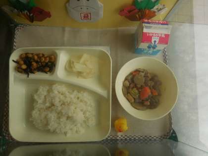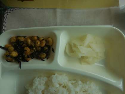 1月12日(火)の給食は筑前煮、ひじき豆、だいこんのゆず風味、ごはん、牛乳です。筑前煮はけいにく、こんにゃく、れんこん、ごぼう、にんじん、さんどまめ、しいたけが入っています。ひじき豆はだいず豆にひじきを和えて味付けしています。だいこんのゆず風味はだいこんにゆずの風味を付けています。おいしかったです。ごちそうさまでした。
