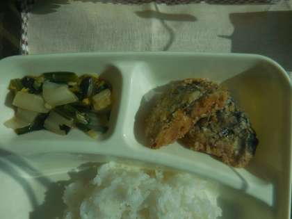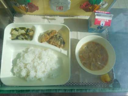 1月14日(木)の給食はさばのカレーたつたあげ、さつまいもとうすあげのみそ汁、はくさいとほうれんそうの煮びたしです。さばのカレーたつたあげはさばにカレー粉で味付けしカラッと揚げています。さつまいもとうすあげのみそ汁はさつまいも、うすあげ、たまねぎ、にんじん、あおねぎ、えのきたけが入っています。はくさいとほうれんそうの煮びたしははくさいとほうれんそうのあっさり味です。おいしかったです。ごちそうさまでした。