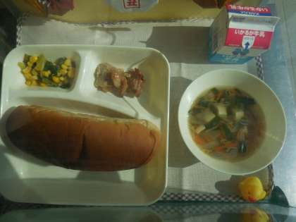 1月15日(金)の給食は鶏肉のオイスターソース焼き、中華スープ、チンゲンサイとコーンの中華あえ、パン、牛乳です。は鶏肉のオイスターソース焼きはけいにくににんにく、しょうがで香りし、オイスターソースで味付けしています。中華スープはぶたにく、とうふ、たまねぎ、ブラックマッペもやし、にんじん、にら、が入っています。チンゲンサイとコーンの中華あえはチンゲンサイとコーンがマッチしています。おいしかったです。ごちそうさまでした。