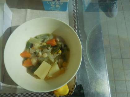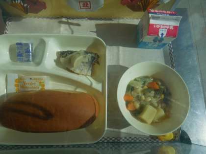 1月18日(月)の給食はあじのレモンマリネ、てぼ豆のスープ煮、固形チーズ、パン、牛乳です。あじのレモンマリネはカラッと揚げたあじにレモン風味のさわやかな味です。てぼ豆のスープ煮はぶたにく、じゃがいも、てぼ豆、キャベツ、にんじん、さんどまめ、コーンが入っています。おいしかったです。ごちそうさまでした。