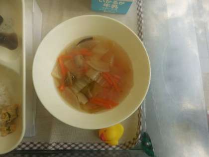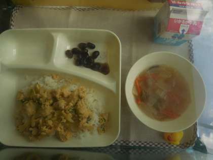 1月19日(火)の給食は親子丼、すまし汁、黒豆の煮もの、牛乳です。親子丼はけいにく、けいらん、たまねぎ、あおねぎが入っています。すまし汁ははくさい、だいこん、にんじん、しいたけ、が入っています。おいしかったです。ごちそうさまでした。