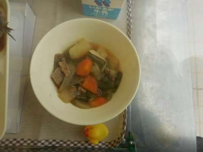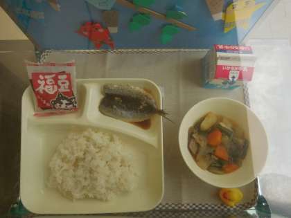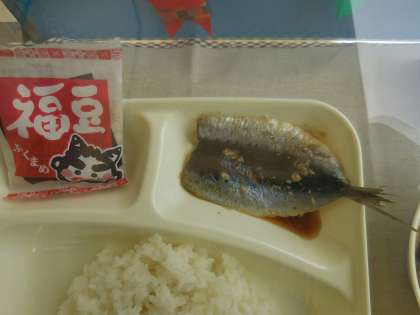 2月1日(月)の給食は節分の行事献立です。いわしのしょうがじょうゆかけ、含め煮、いり大豆、ごはん、牛乳です。いわしのしょうがじょうゆかけはいわしをやわらかくあまからくしてあります。含め煮はぶたにく、じゃがいも、だいこん、にんじん、さんどまめ、しめじが入っています。おいしかったです。ごちそうさまでした。