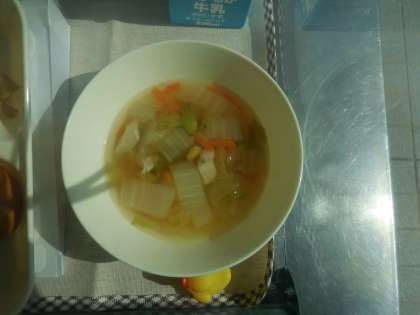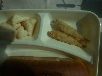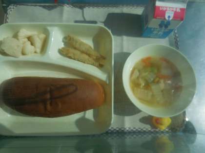 2月3日(火)の給食はわかさぎフライ、はくさいスープ、カリフラワーのサラダ、パン、牛乳です。わかさぎフライはからっと揚って骨も食べることができました。はくさいスープはけいにく、はくさい、コーン、にんじん、むきえだまめが入っています。カリフラワーサラダもさわやかな味です。おいしかったです。ごちそうさまでした。