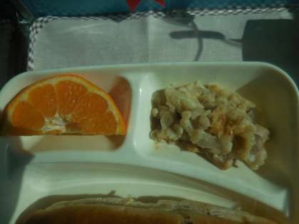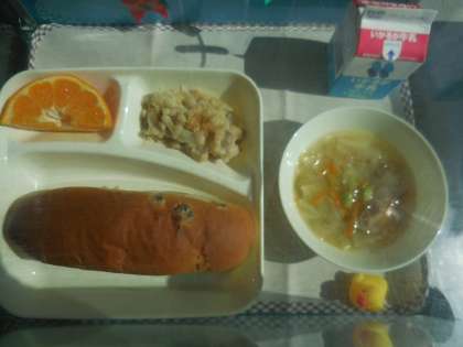 2月5日(金)の給食は押し麦のグラタン、スープ、いよかん、パン、牛乳です。押し麦のグラタンはけいにく、おしむぎ、たまねぎ、マッシュルーム、が入っています。スープはぶたにく、キャベツ、だいこん、にんじん、むきえだまめ、が入っています。おいしかったです。ごちそうさまでした。