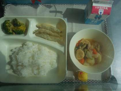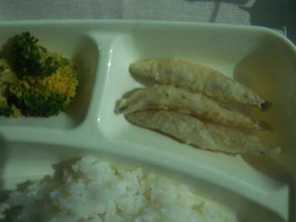 2月12日(金)の給食はきびなごのてんぷら、一口がんもとじゃがいもの煮もの、ブロッコリーのごまあえ、ごはん、牛乳です。きびなごのてんぷらはからっと揚っています。一口がんもとじゃがいもの煮ものはぶたにく、ひとくちがんも、じゃがいも、だいこん、たまねぎ、にんじん、さんどまめが入っています。ブロッコリーのごまあえはあっさり味です。おいしかったです。ごちそうさまでした。