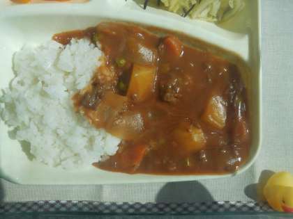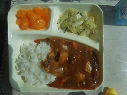 2月16日(火)の給食はハヤシライス、キャベツのひじきドレッシング、みかん、牛乳です。ハヤシライスはぎゅうにく、じゃがいも、たまねぎ、にんじん、グリンピース、セロリが入っています。子ども達の人気メニューです。キャベツのひじきドレッシングはキャベツのひじきをあえています。おいしかったです。ごちそうさまでした。
