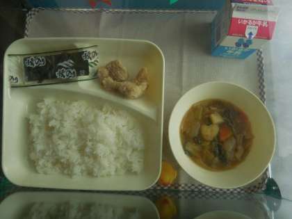 2月17日(水)の給食は鶏肉のからあげ、まる天と野菜のうま煮、焼きのり、ごはん、牛乳です。鶏肉のから揚げはからっと揚っておいしかったです。まる天と野菜のうま煮はまるてん、はくさい、たまねぎ、チンゲンサイ、たけのこ、にんじん、しいたけが入っています。おいしかったです。ごちそうさまでした。