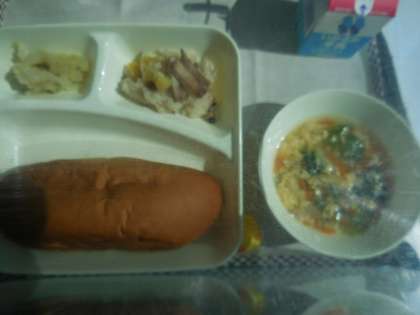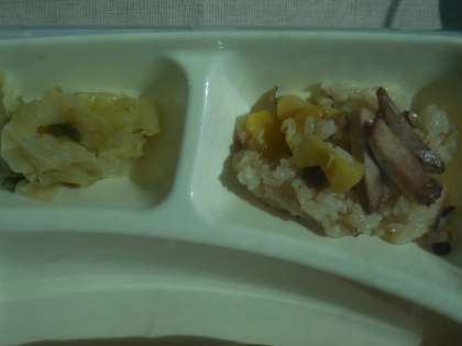 2月18日(木)の給食は中華おこわ、卵スープ、キャベツとピーマンのいためもの、パン、牛乳です。中華おこわはやきぶた、もちごめ、くり、しいたけが入っています。卵スープはけいにく、けいらん、チンゲンサイ、にんじん、ブラックマッペもやしが入っています。キャベツとピーマンのいためものはキャベツとピーマンをおいしくいためています。おいしかったです。ごちそうさまでした。