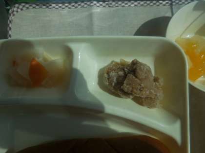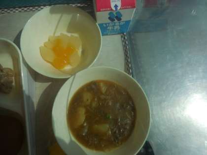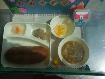 3月9日(火)の給食は「卒業祝い献立」です。フライドチキン、カレーシチュー(近江牛)、おいわいピクルス、フルーツゼリー、パン、牛乳です。フライドチキンはからっと揚っています。カレーシチューはぎゅうにく、じゃがいも、たまねぎ、グリンピース、にんにくが入っています。おいわいピクルスはだいこんとにんじんの紅白です。おいしかったです。ごちそうさまでした。