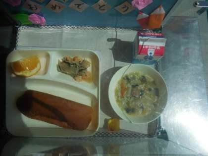3月18日(木)の給食はえびと野菜のいためもの、中華がゆ、はっさく、パン、牛乳です。はえびと野菜のいためものはえび、たまねぎ、しょうがが入っています。中華がゆはにくだんご、せいはくまい、だいこん、チンゲンサイ、はくさい、にんじん、しいたけ、が入っています。6年生は小学校生活最後の給食です。おいしかったです。ごちそうさまでした。