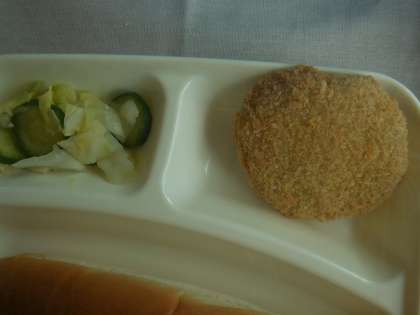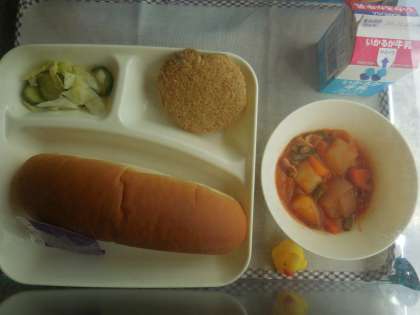 3月22日(月)の給食はチキンレバーカツ、ケッチャプ煮、キャベツときゅうりのサラダ、パン、牛乳です。チキンレバーカツはからっと揚っておいしかったです。人気メニューです。ケッチャプ煮はぶたにく、じゃがいも、たまねぎ、にんじん、さんどまめ、トマト、が入っています。キャベツときゅうりのサラダはあっさりしています。おいしかったです。ごちそうさまでした。