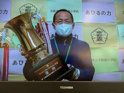 今日の全校朝会では、先日行われたサッカーのライオンズカップで優勝した西脇FCに、校長先生から優勝トロフィーの授与がありました。