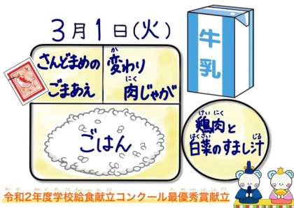 今日は、学校給食献立コンクール最優秀賞献立でした。変わり肉じゃがは定番の肉じゃがをアレンジして、みそを使って味付けをしています。とってもおいしかったそうです。