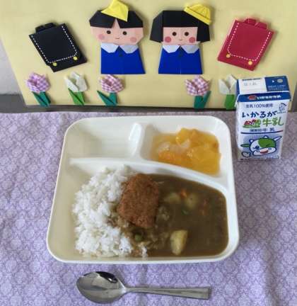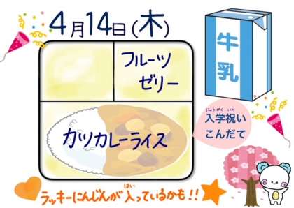 今日は、入学祝い献立でした。1年生の入学をお祝いし、2年生から6年生の進級を喜ぶ行事食です。新食品であるみかんゼリーとフルーツの缶詰を使ったフルーツゼリーがとても好評でした。