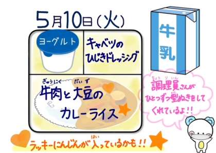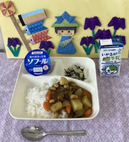 今日は。カレーライスに、ハートや星、うさぎの形のにんじんが入っているラッキーにんじんの日でした。そして特別に、カメの飾り切りにんじんも入っていました。子どもたちはワクワクしながら楽しく給食を食べました。