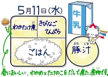 春に収穫されるたけのことわかめは、「春先の出会いもの」といわれ、煮ものや汁ものによく組み合わされています。今日は「わかたけ煮」として登場し、旬のおいしさを味わいました。