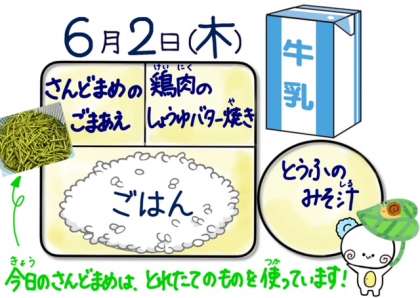 今日は鶏肉のしょうゆバター焼きが大好評で、もっとたくさん食べたかった!と話してくれました。また、今の季節が旬である、生のさんどまめを使った「さんどまめのごまあえ」も登場しました。