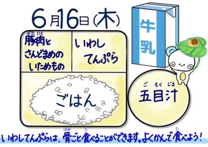 今日は、砂糖、みりん、米酢、こいくちしょうゆで作ったタレをかけた「いわしてんぷら」が登場しました。骨ごと食べられるため、カルシウムをたくさん摂ることができました。