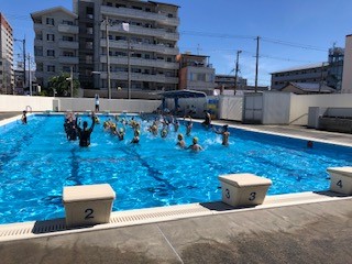 今日は、6年生と1年生がいっしょにプールに入って交流しました。