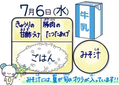 「豚肉のたつたあげ」は、豚肉にしょうが汁、料理酒、こいくちしょうゆで下味をつけ、でんぷんをまぶして揚げています。とても好評で、もっとたくさん食べたかったー!と話してくれました。