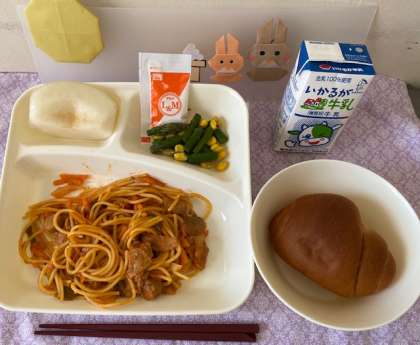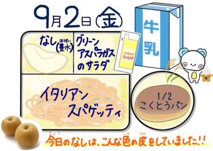 今日は旬の果物である、なしが登場しました。1玉1玉、調理員さんが丁寧に皮を剥いて食べやすく切ってくださいました。