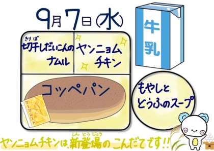 今日は、新献立の「ヤンニョムチキン」が登場しました。新しい献立に子どもたちはワクワクし、めっちゃおいしかったー!!と大好評でした。