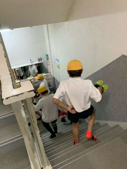 もしものときに備えて避難経路を確認します。 部屋班で静かに素早く移動できました。