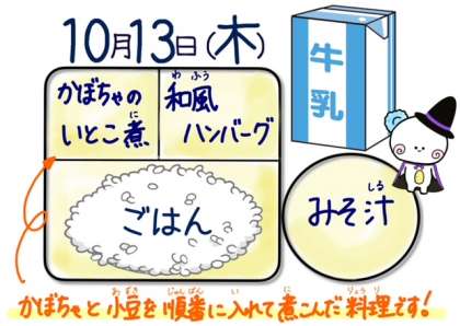 今日は、だしで煮上げたかぼちゃを砂糖、みりん、うすくちしょうゆで味付けし、小豆を加えて煮た、「かぼちゃのいとこ煮」が登場しました。かぼちゃがやわらかく、おいしい一品でした。