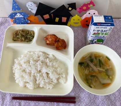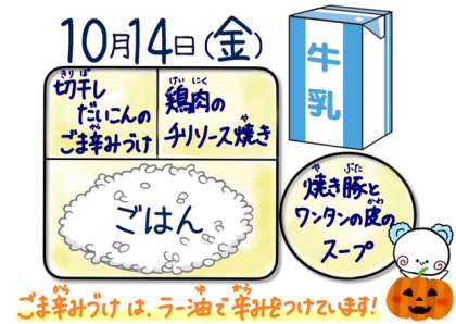 今日は、茹でた切干しだいこんときゅうりに、すりごま、砂糖、米酢、うすくちしょうゆ、ラー油で作ったタレに漬けた、「切干しだいこんのごま辛みづけ」が登場しました。ごまの香りとラー油のピリ辛がおいしい一品でした。