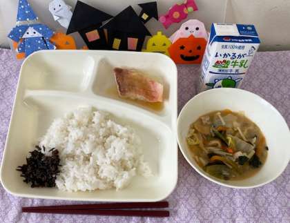 「あかうおのみぞれかけ」は、焼き物機という機械であかうおを焼いています。そこに、みりん、うすくちしょうゆ、ゆず果汁で味をつけただいこんおろしをかけていただきました。さっぱりとした味でおいしかったようです。