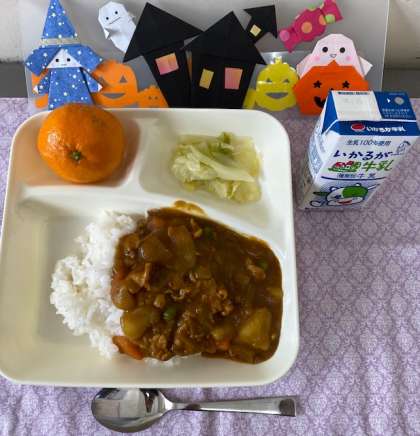 小麦アレルギーのある児童も食べることができるように、今回は米粉のカレールウの素を使っています。ラッキーにんじんも入り、楽しんで食べることができました。