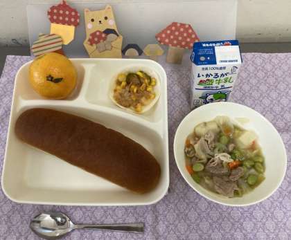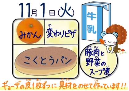 今日の変わりピザは、ぎょうざの皮をピザ生地に見立て、ツナ、コーン、ピーマン、ピザソース、チーズを混ぜ合わせた具材をのせて焼いています。毎回好評なおかずです。