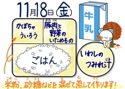 「いわしのつみれ汁」には、しょうが汁、料理酒で下味つけたいわしだんごとだいこん、ごぼう、にんじん、みつばが入っています。下味をしっかりとつけることで、臭みが減り食べやすくなっています。