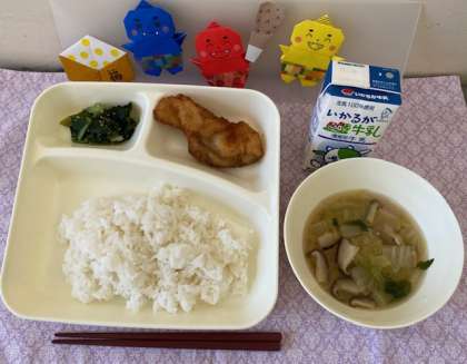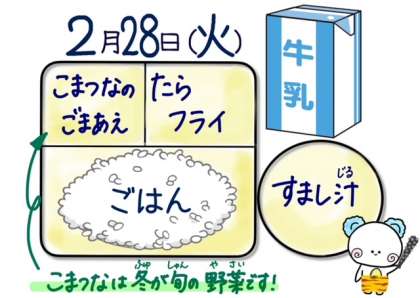 冬が旬であるこまつなを使った、「こまつなのごまあえ」が登場しました。すりごま、砂糖、うすくちしょうゆで味付けし、あっさりとしておいしい一品でした。